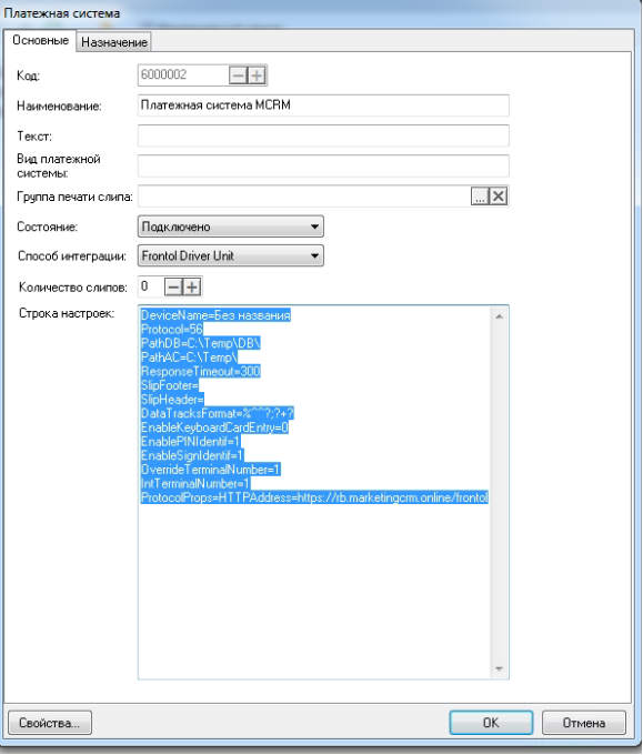 · Перейдите по кнопке "Свойства…" на страницу драйвера платежных систем. В поле "Тип АС" укажите "Frontol Priority API". Поле "Формат магнитной полосы" заполните опционально.