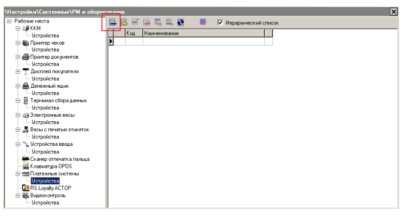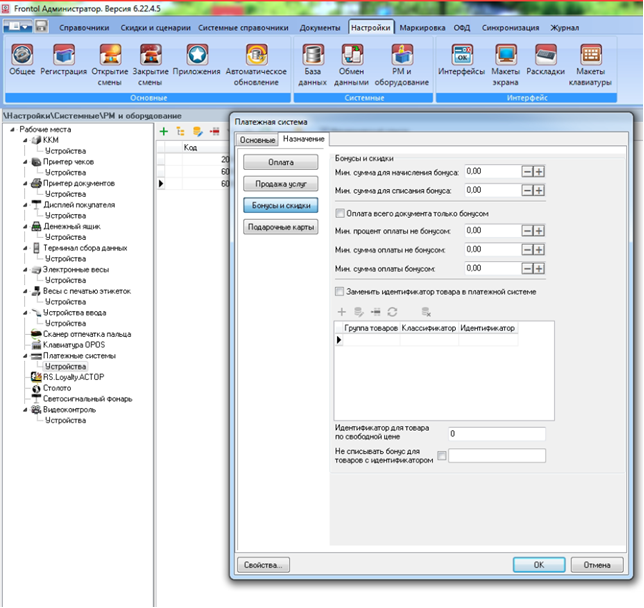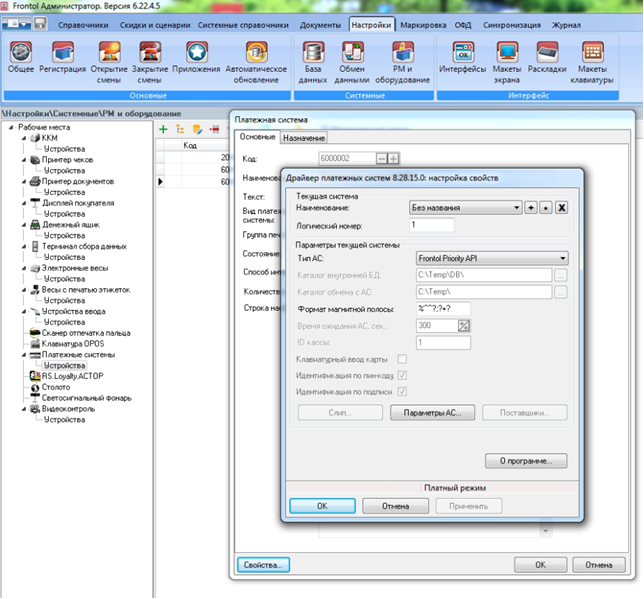 · Для настройки Frontol API перейдите в группу "Настройки" и далее "Системные/РМ и оборудование/Платёжные системы/Устройства".