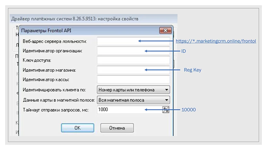 · Введите в окне "Парметры Frontol API" следующие данные для подключения: