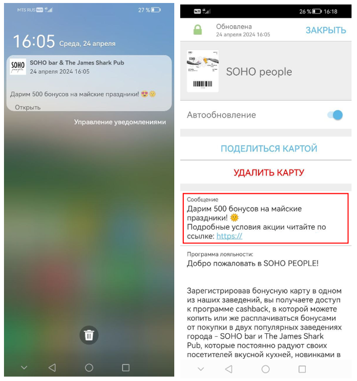 Wallet – это сообщение Wallet, которое включает в себя push и текстовое сообщение на обороте карты в приложении.