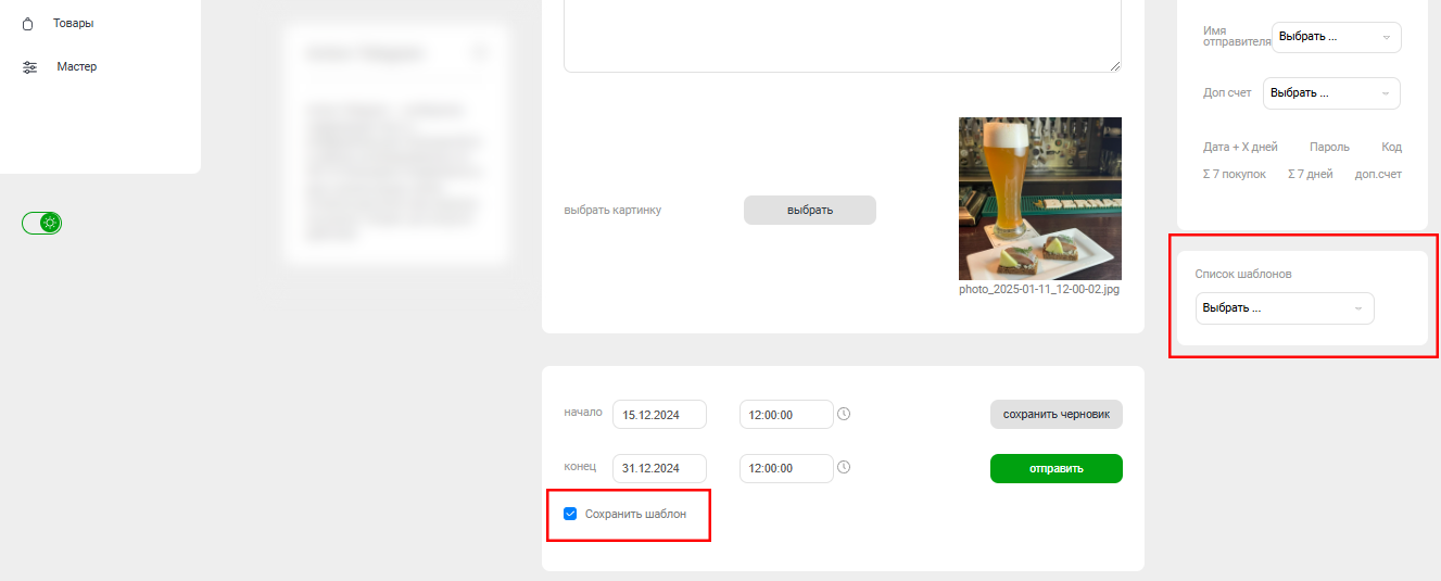 Если вы поставите галочку "Сохранить шаблон", то в будущем сможете выбирать данный шаблон из списка.
