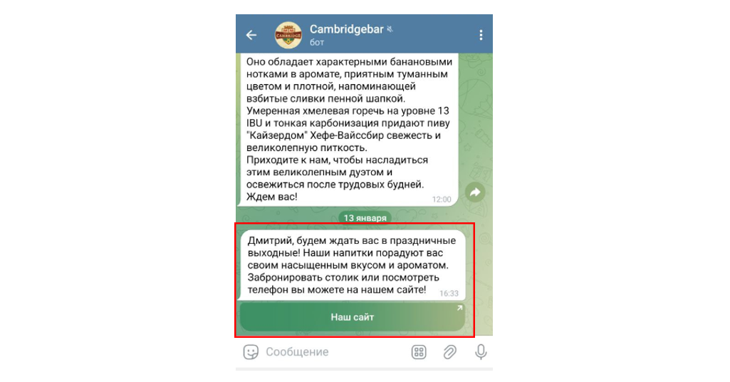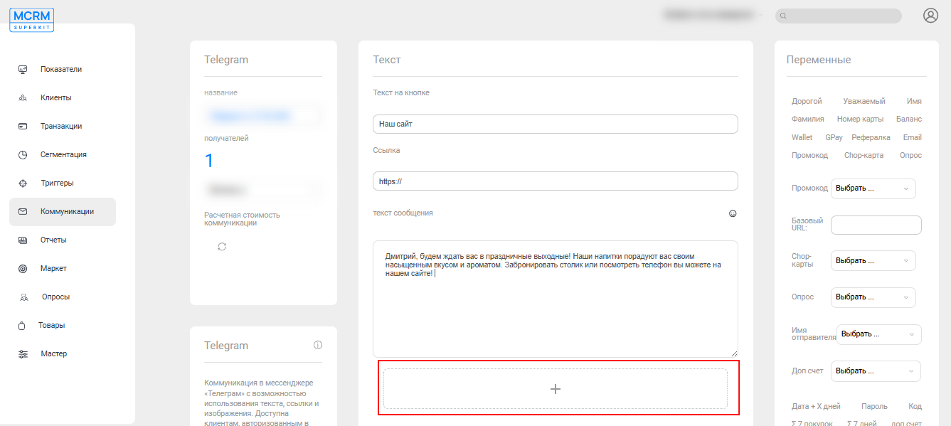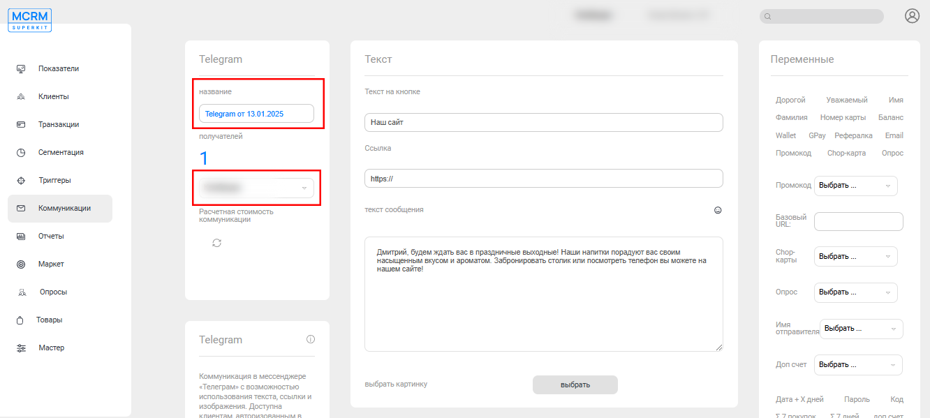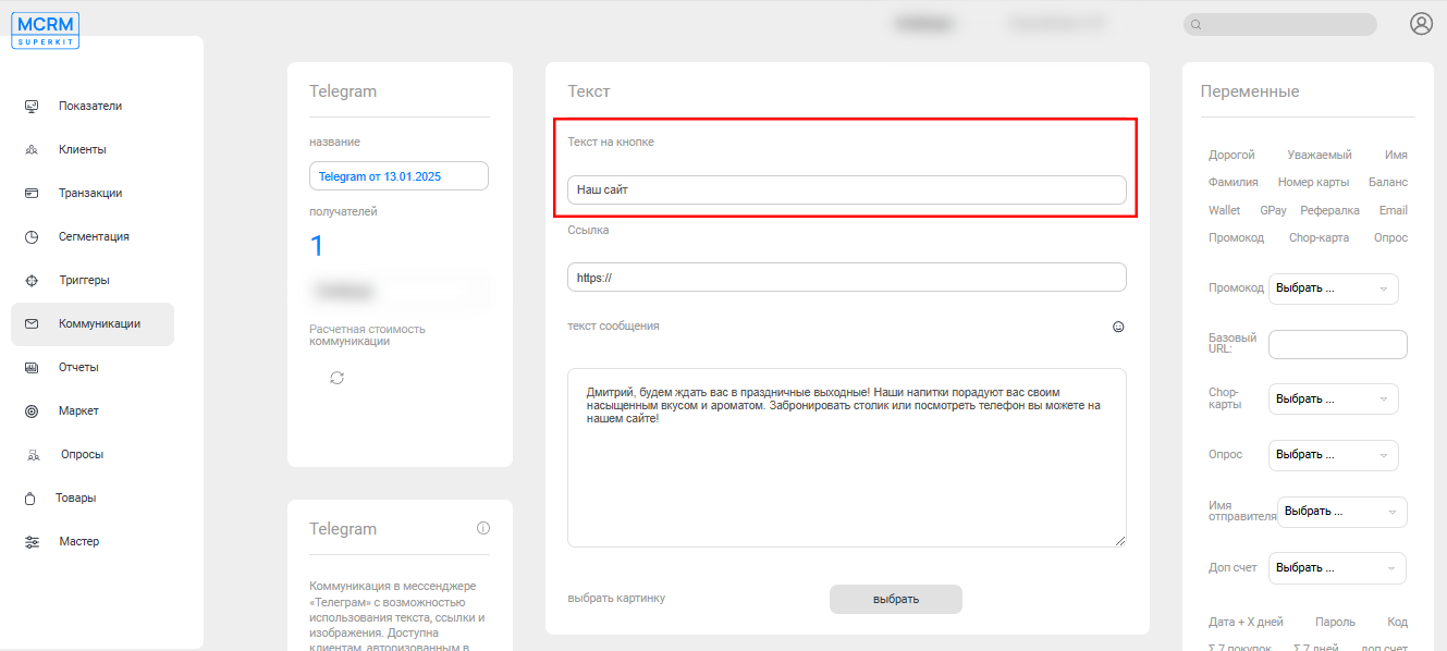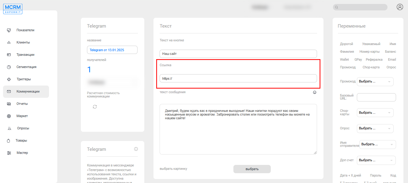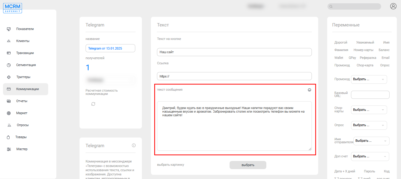 · В третье поле введите текст сообщения, при необходимости используйте эмодзи и ссылки (в мессенджере клиента они преобразуются в гиперссылки).