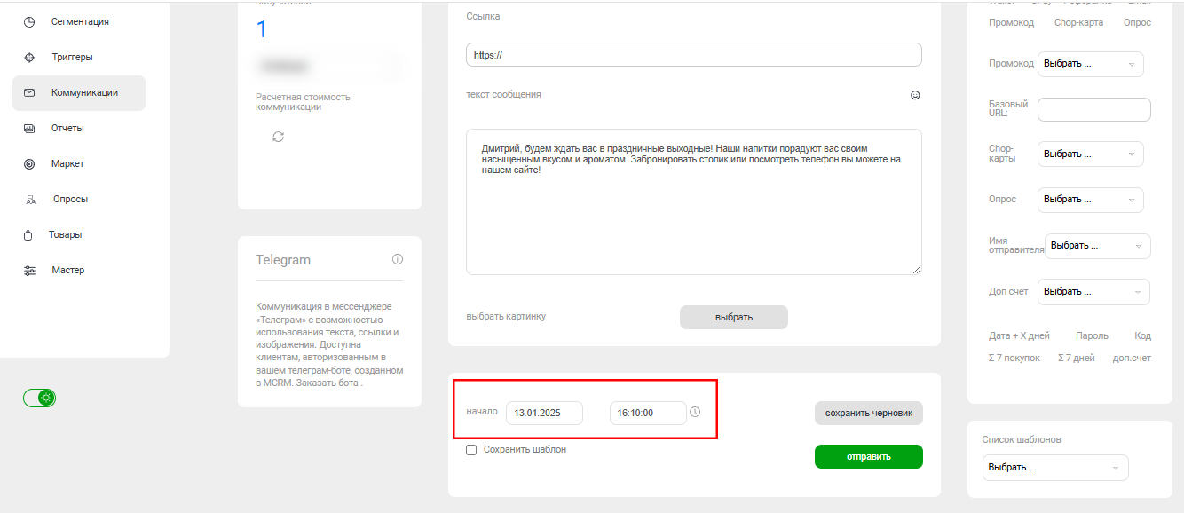 При нажатии "Сохранить черновик" вы создаете черновик сообщения, к которому можете вернуться, перейдя в раздел "Коммуникации" и выбрав в фильтре черновики.