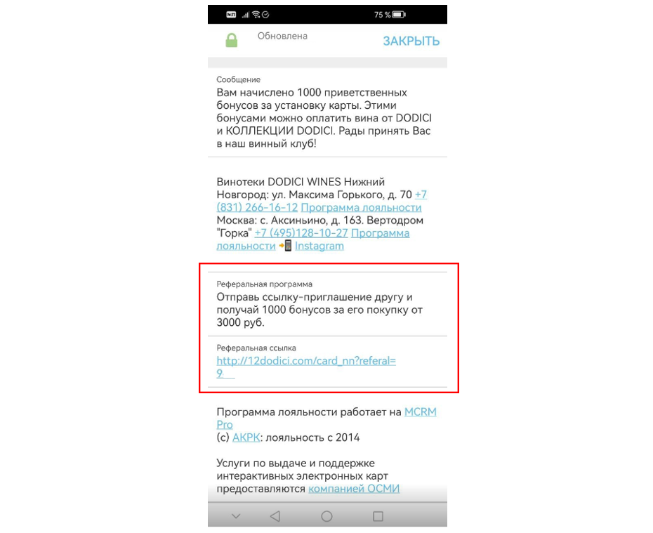 Кроме того, если у клиента подключена карта Wallet, его реферальная ссылка всегда отображается на обороте карты в мобильном приложении. Это позволяет в любой момент открыть карту, скопировать ссылку и отправить ее друзьям. Сам клиент может делиться своей реферальной ссылкой где угодно: в мессенджерах, социальных сетях, по email, в личных сообщениях, в любом удобном ему канале.
