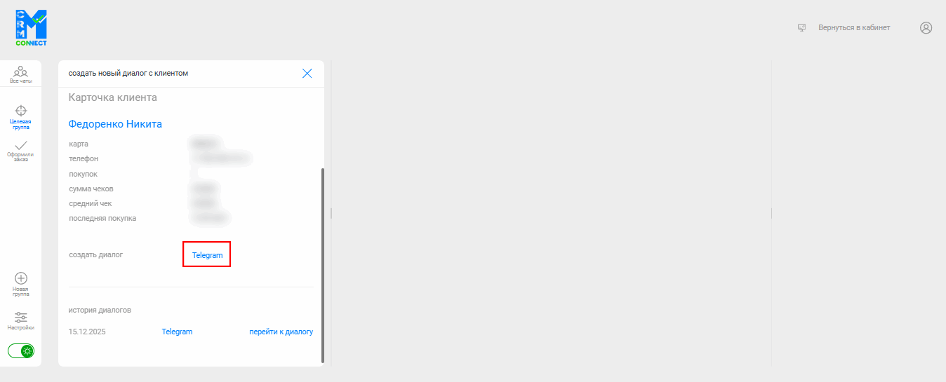 Система автоматически найдет клиента. В его карточке напротив поля "Создать диалог" выберите канал связи и нажмите на него (например, "Telegram"), чтобы добавить чат с клиентом в выбранную группу.