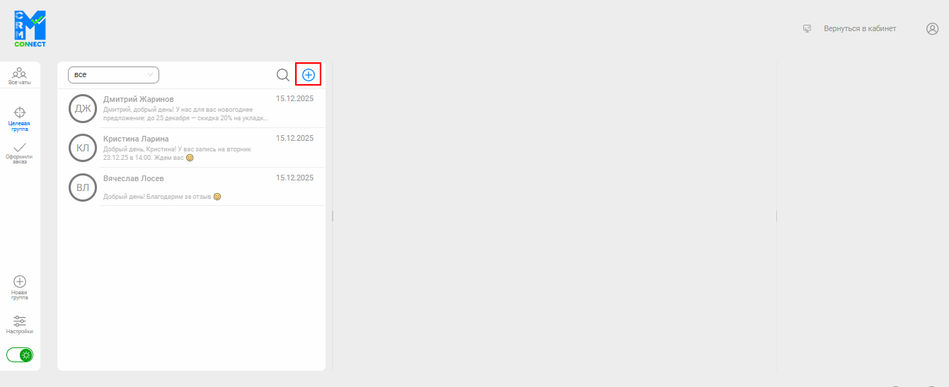 Вверху списка диалогов находится кнопка "+" (добавление клиента). Нажмите на нее.