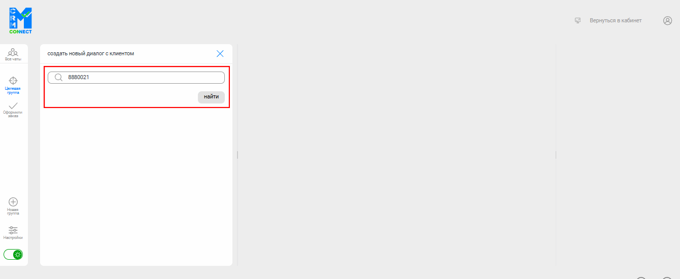 Откройте модуль Connect и выберите в левом меню группу, в которую хотите добавить диалог с клиентом (нажмите на нее).