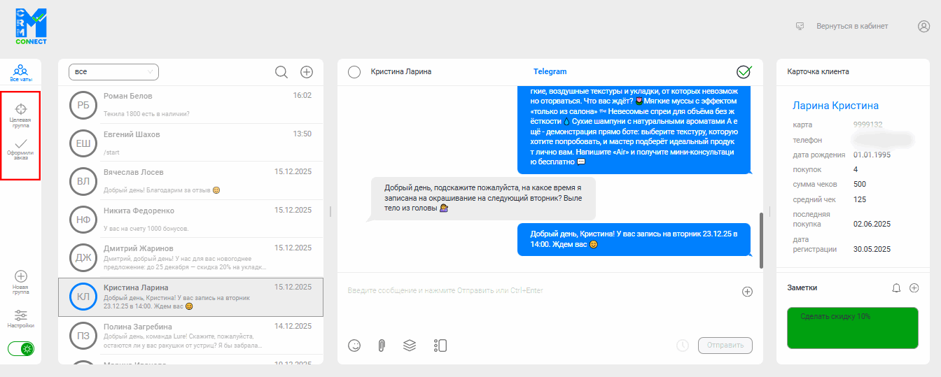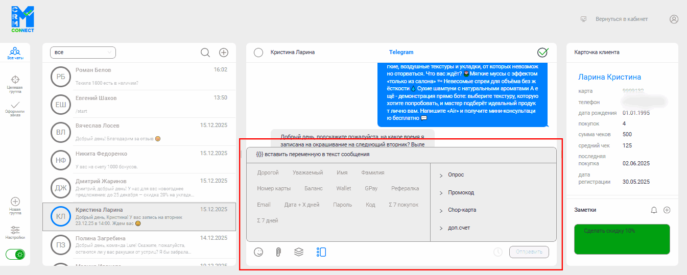 После завершения подключения новый раздел появится в боковом меню маркетингового кабинета, и вы сможете начать переписку с клиентами - писать, получать сообщения, использовать шаблоны, переменные и работать с заметками.