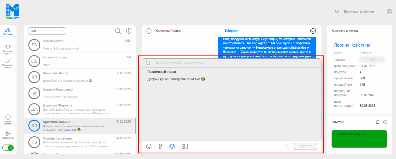 Сохраняйте часто используемые фразы ("Спасибо за отзыв!", "Напоминаем о записи на завтра") и вставляйте их одним кликом.