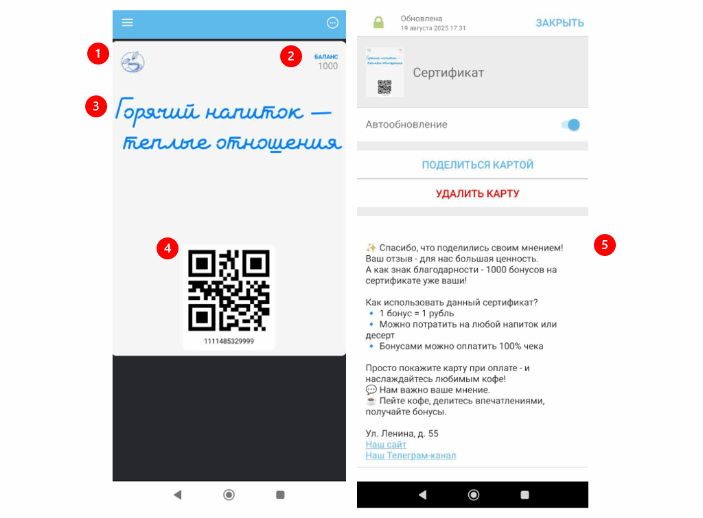 Сертификат подходит для дополнительной мотивации клиентов, подарков или маркетинговых акций. Он выдается клиенту с конкретной суммой, которую можно потратить целиком или частично, и работает как электронная подарочная карта Wallet, которую клиент может скачать в свой смартфон и использовать при оплате покупок на кассе.