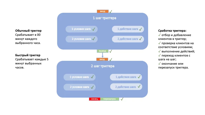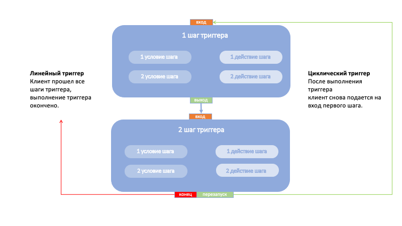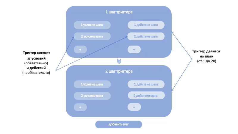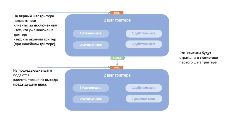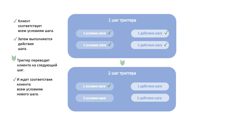 Каждый новый шаг триггера будет последовательным выполнением условий и действий, обозначенных в этих шагах. При этом клиент не может перейти на следующий шаг, если текущий для него полностью не завершился.