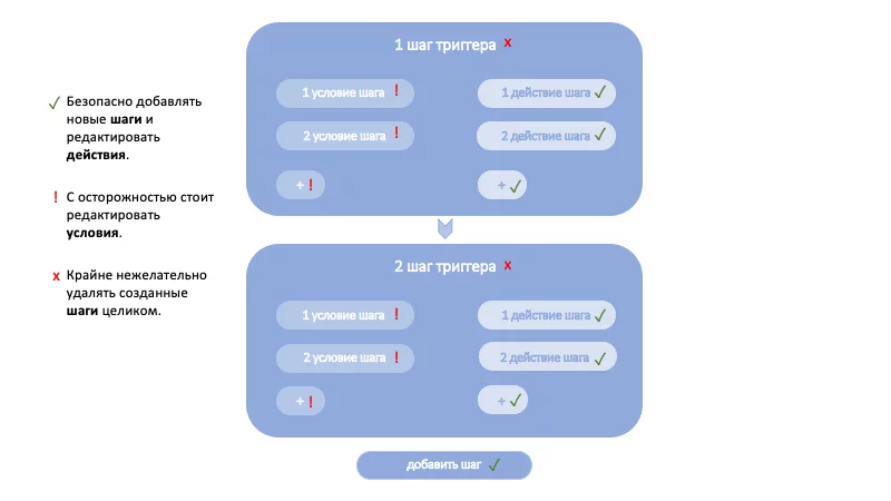 Самое простое и безопасное изменение в триггере – это добавление новых шагов. А вот исправление условий может отразиться на уже включенных в триггер клиентах, например, они могут не перейти на следующий шаг. Также крайне нежелательно целиком удалять созданные шаги, тем более, если на них уже присутствуют клиенты. Это может привести к автоматическому перемещению клиентов на шаг вперед и пропуску ими ряда условий и действий предыдущего шага.