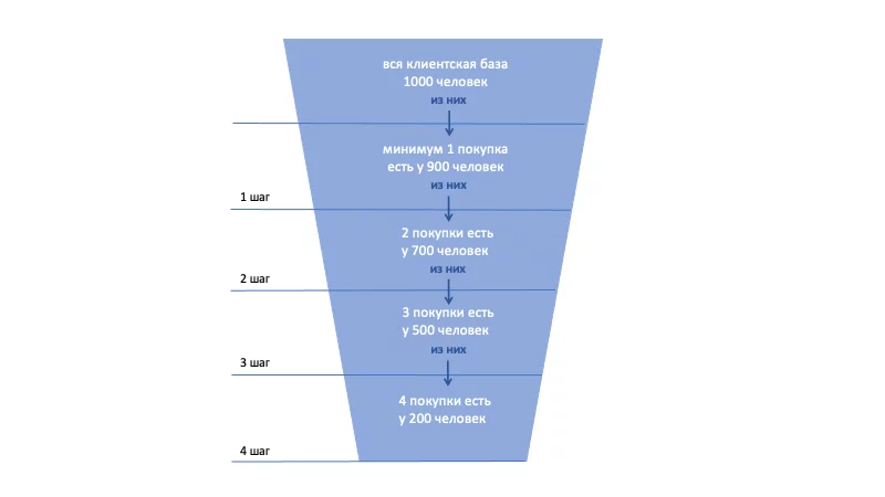 Другими словами, клиенты на каждый шаг триггера отбираются по принципу воронки:
