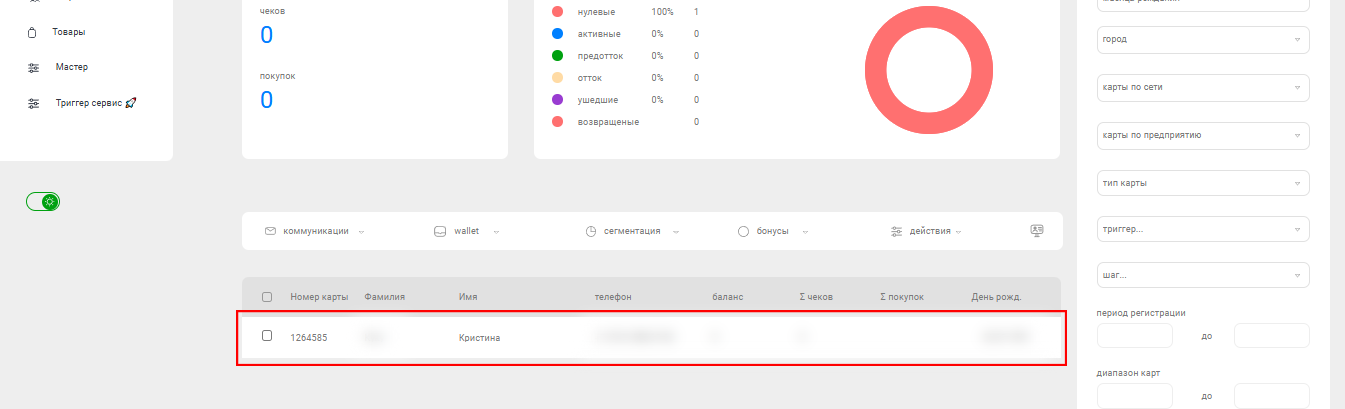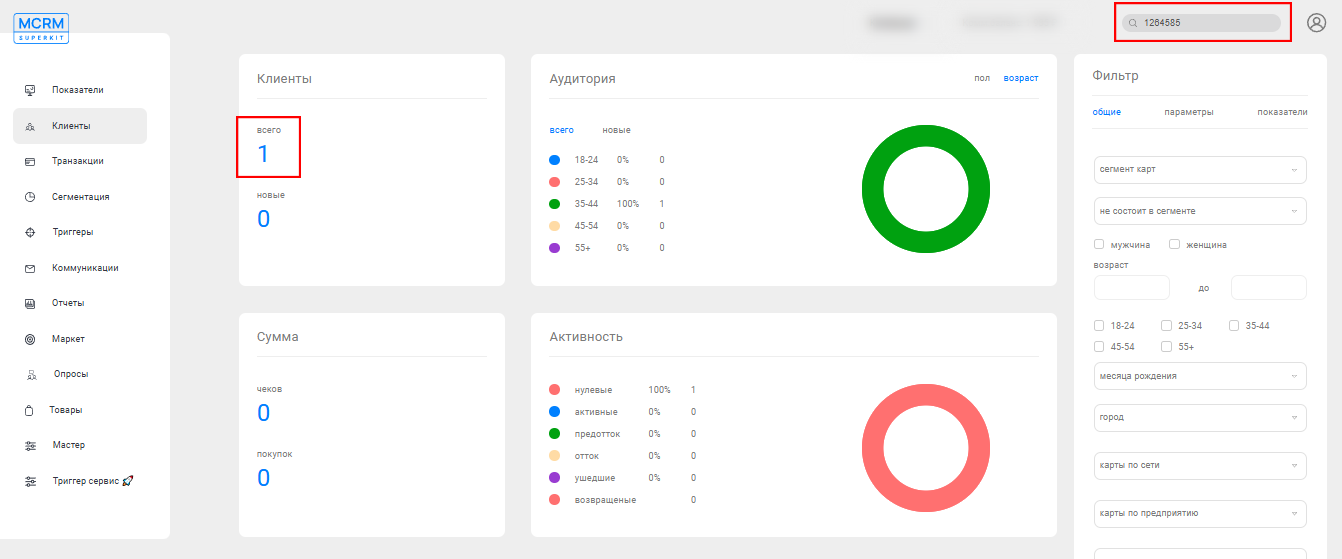 Найдите клиента через строку поиска. Дождитесь, пока система отобразит его в разделе Клиенты, не переходите в личную карточку. Убедитесь, что в списке отображается нужный клиент.