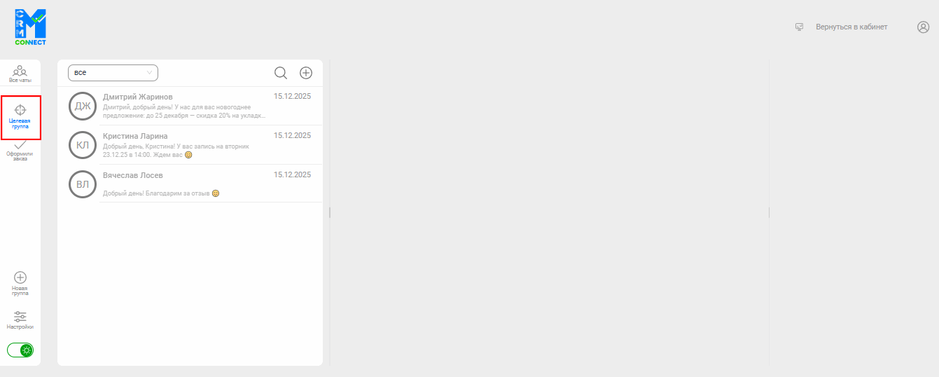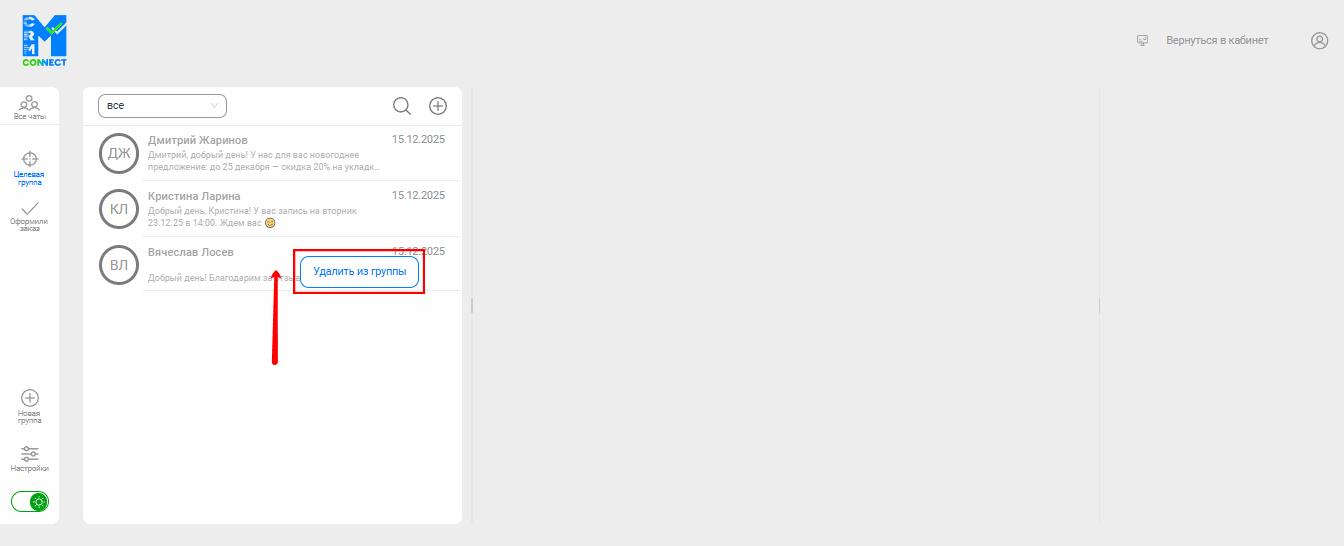 Откройте модуль Connect и перейдите в группу клиентов, из которой нужно удалить клиента.