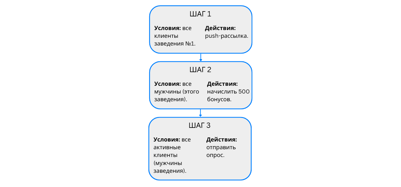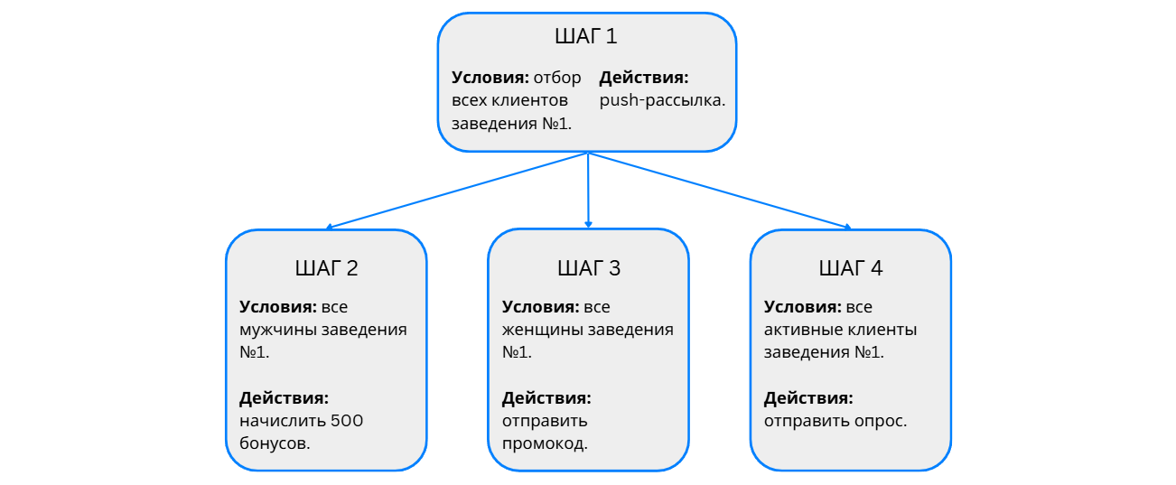 На первый шаг также рассматриваются все имеющиеся в базе клиенты. А затем механика позволяет из одной аудитории, которая сформировалась в 1 шаге, создать несколько разных сегментов последующими шагами. И настроить для каждого из них индивидуальные действия. При этом по каждой ветке клиентов (каждый шаг, начиная со второго) действия отработают одновременно.